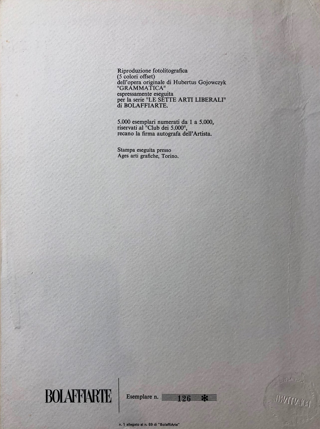 Riproduzione fotolitografica (5 colori offset) dell’opera originale di Hubertus Gojowczyk "Grammatica" espressamente eseguita per la serie "Lo zodiaco" di Bolaffi Arte. Dim. 28x21 Opera senza cornice Esemplare 126/5000 Timbro a secco Bolaffi Arte in basso a sx Firma in basso a dx
