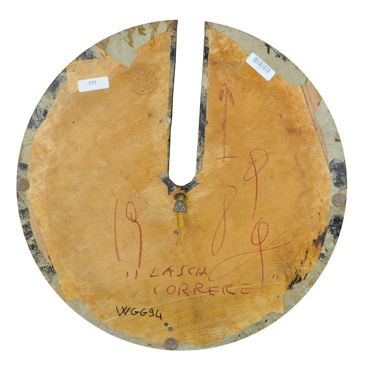 Oggetti e tecnica mista su legno Anno 1989 Diam. 55 Autentica su foto dell'artista Opera archiviata presso Archivio generale opere Bruno Ceccobelli al N. M 26 in data 20/11/1995 Al verso data, titolo e firma